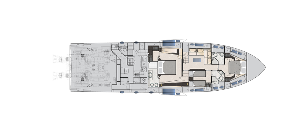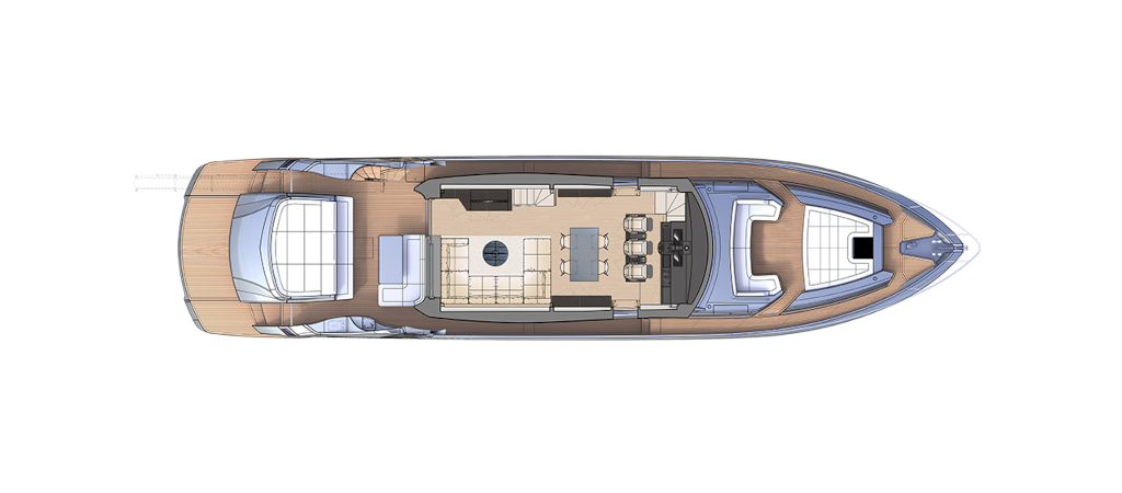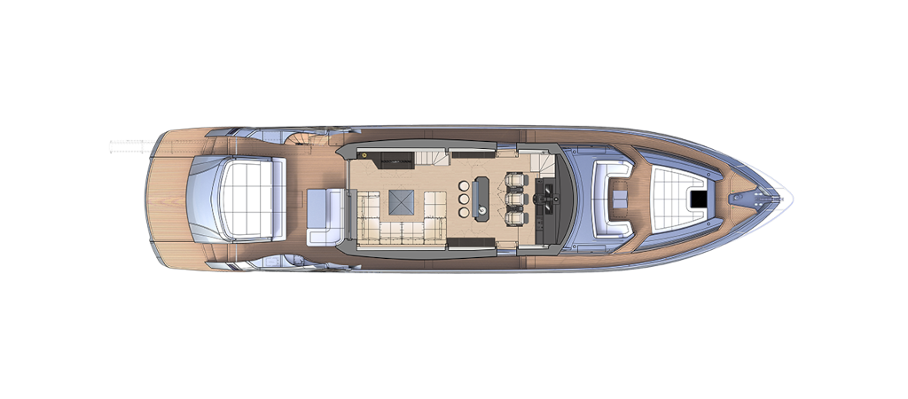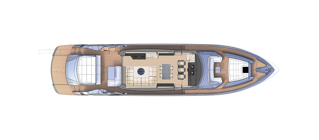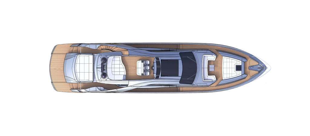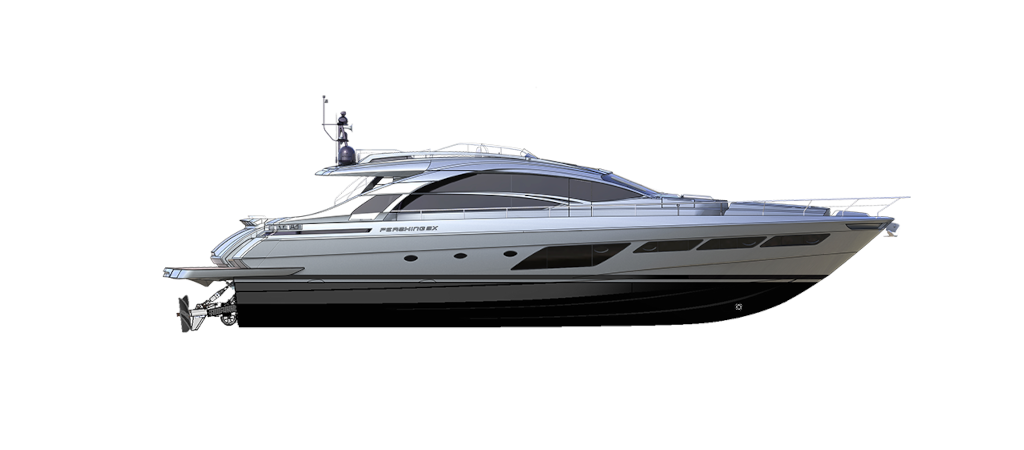 The latest addition to the Pershing fleet. Nothing like anything seen before, thanks to the superstructure entirely in carbon fibre. Yet another huge leap forward for the new Pershing style, each of its parts designed to amaze, from its interior lines to its technological solutions, through to its performance. One of the most outstanding of its surprising innovations is that the access ladder into the flying bridge is completely built into the unmistakable Pershing wing, transforming the latter from an aesthetic trademark into a functional element, creating more space in the cockpit with a big-impact solution. Double motorization guarantees 45 knots for the standard version and up to 48 knots for the optional version, for truly exciting performance.
