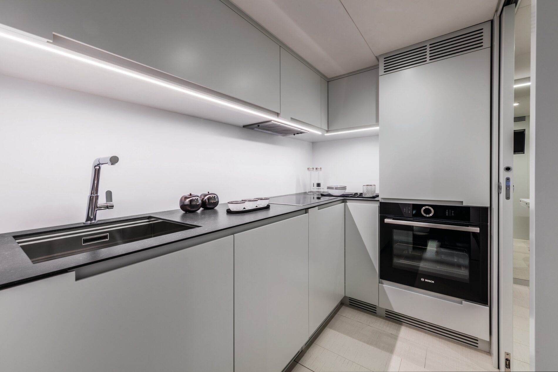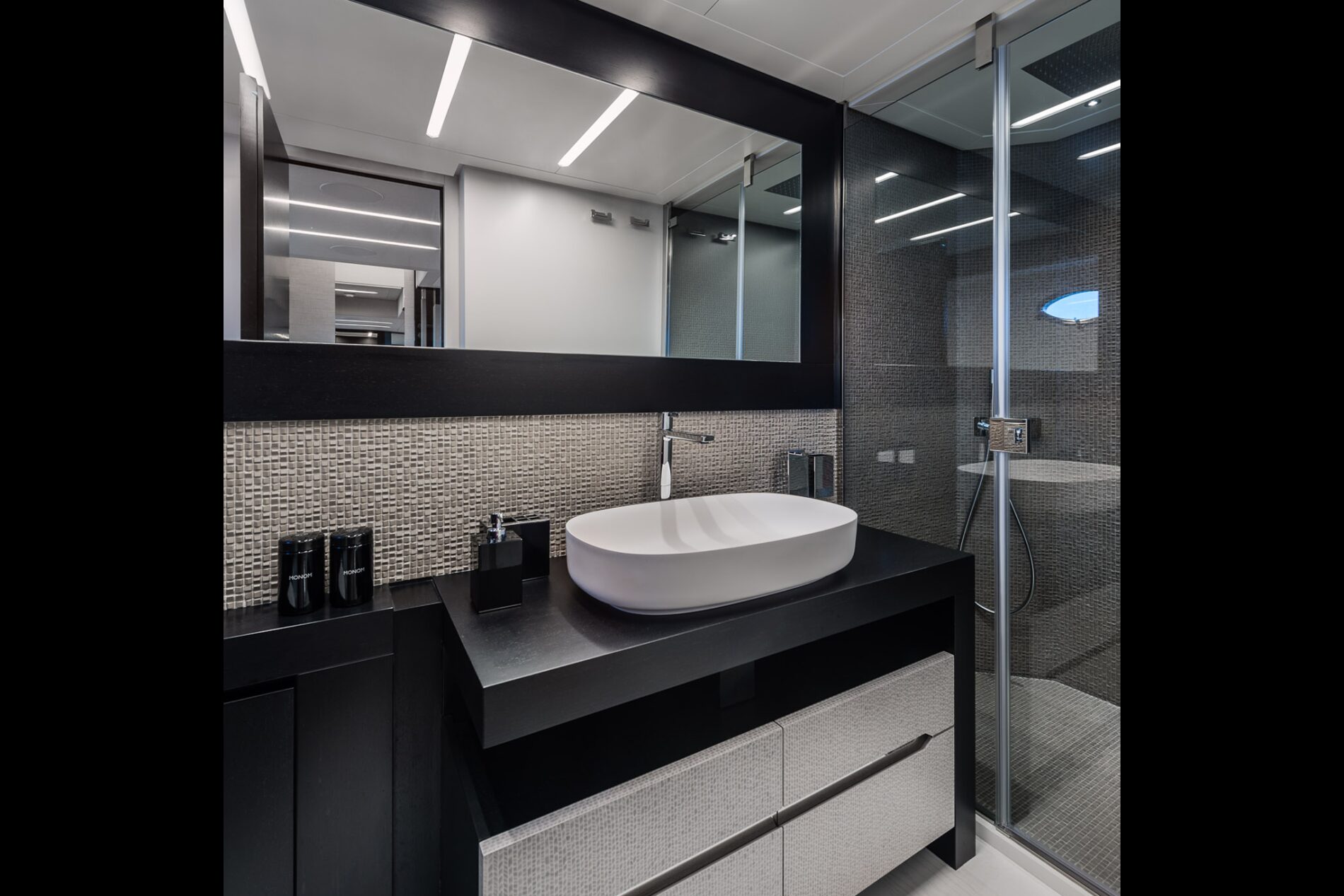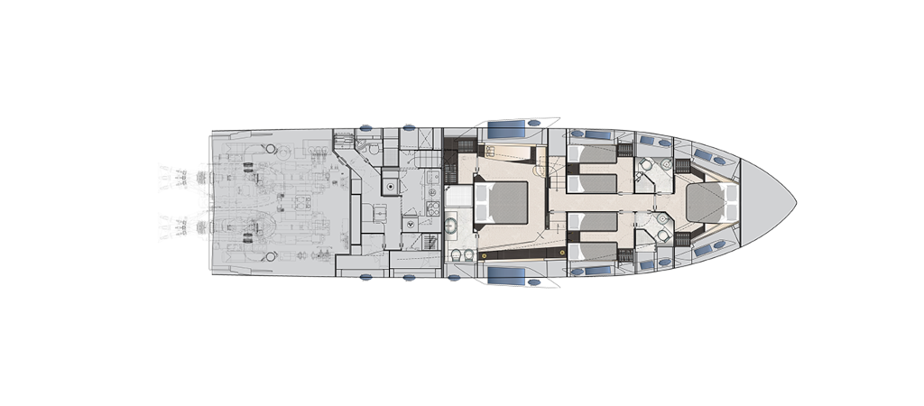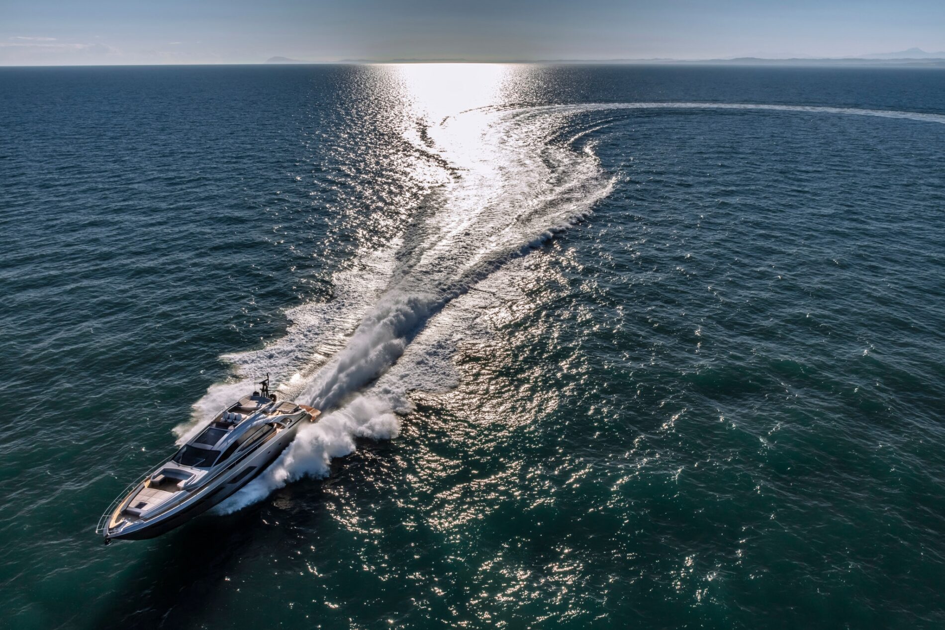 The latest addition to the Pershing fleet. Nothing like anything seen before, thanks to the superstructure entirely in carbon fibre. Yet another huge leap forward for the new Pershing style, each of its parts designed to amaze, from its interior lines to its technological solutions, through to its performance. One of the most outstanding of its surprising innovations is that the access ladder into the flying bridge is completely built into the unmistakable Pershing wing, transforming the latter from an aesthetic trademark into a functional element, creating more space in the cockpit with a big-impact solution. Double motorization guarantees 45 knots for the standard version and up to 48 knots for the optional version, for truly exciting performance.