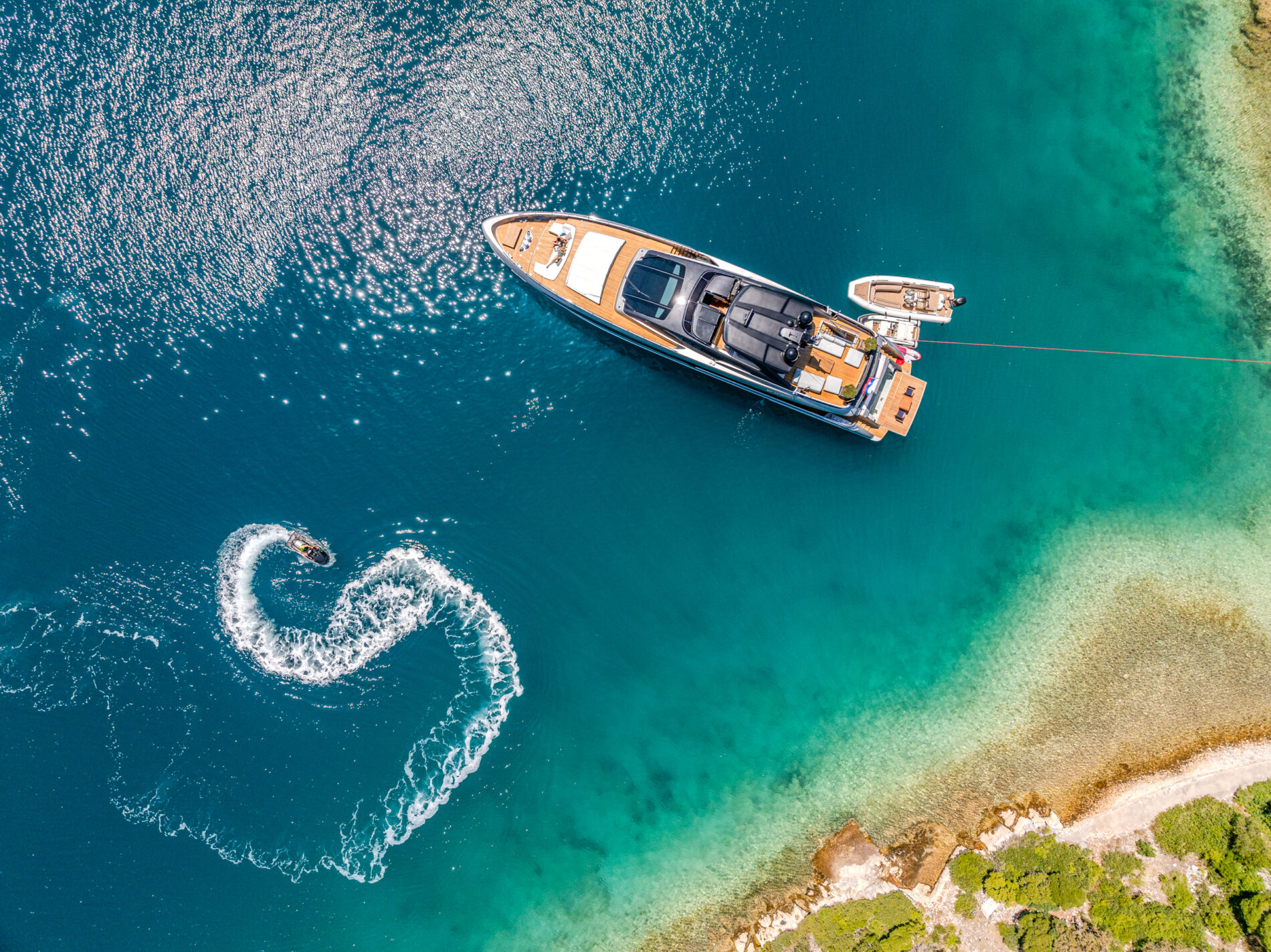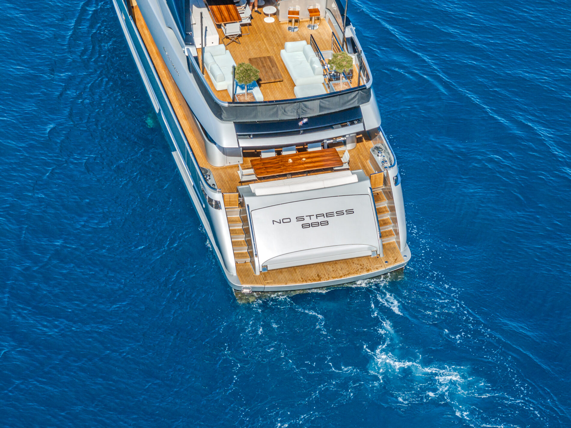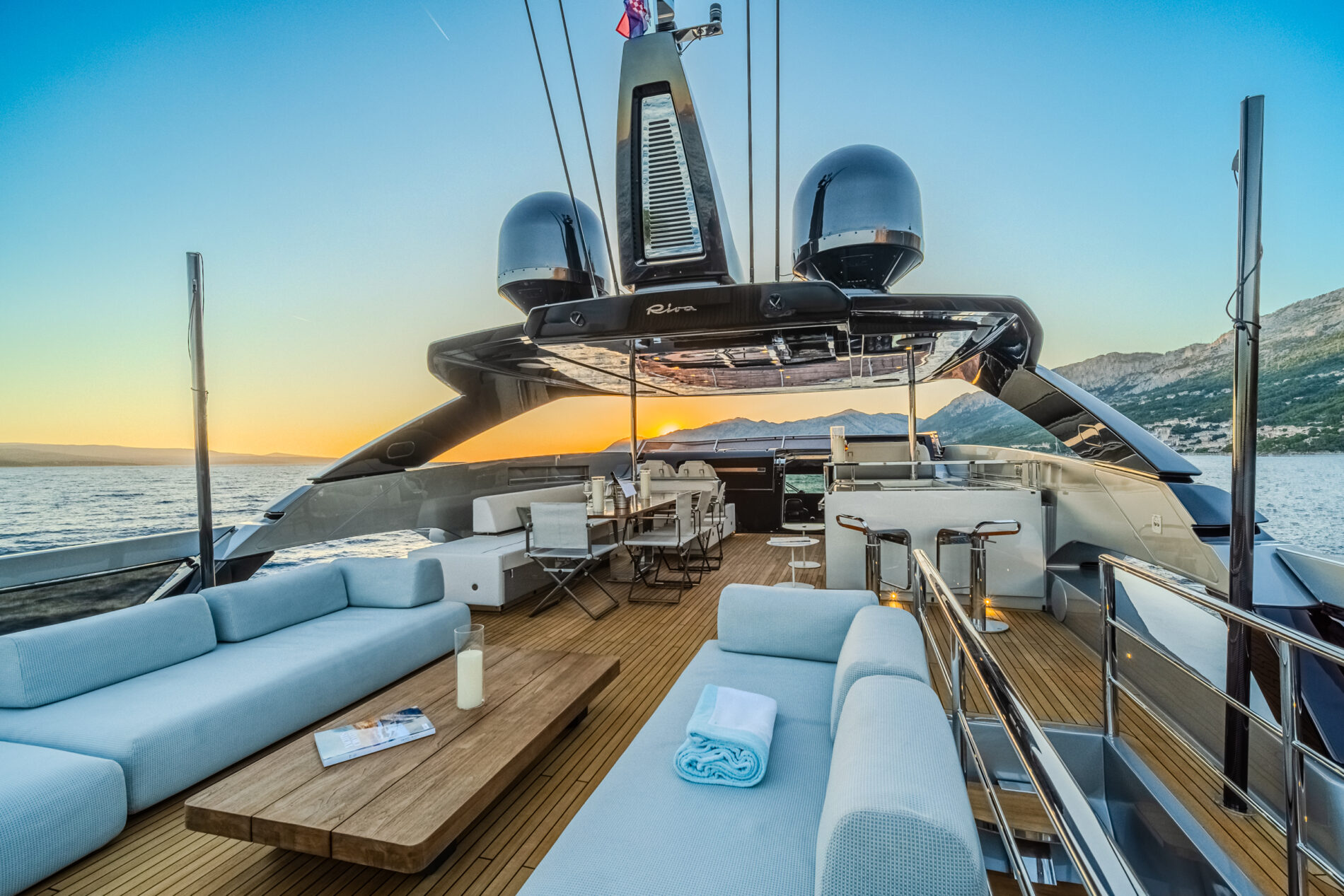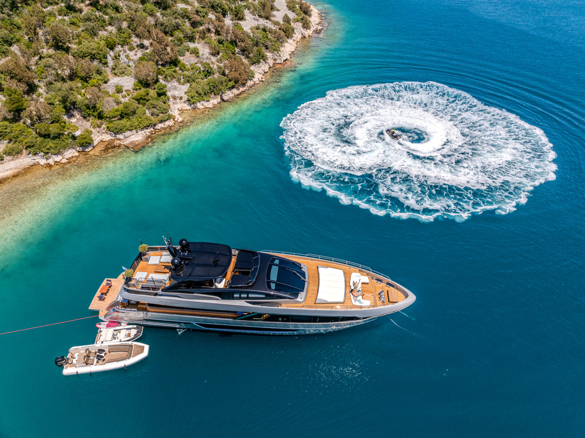 The yacht features a fantastic beach area with a large swimming platform and an extensive selection of water toys, such as jet ski, sea bobs, and paddleboards. The expansive sundeck includes a wet bar, lounge corner, and al fresco dining table, offering guests a memorable experience surrounded by breathtaking scenery.