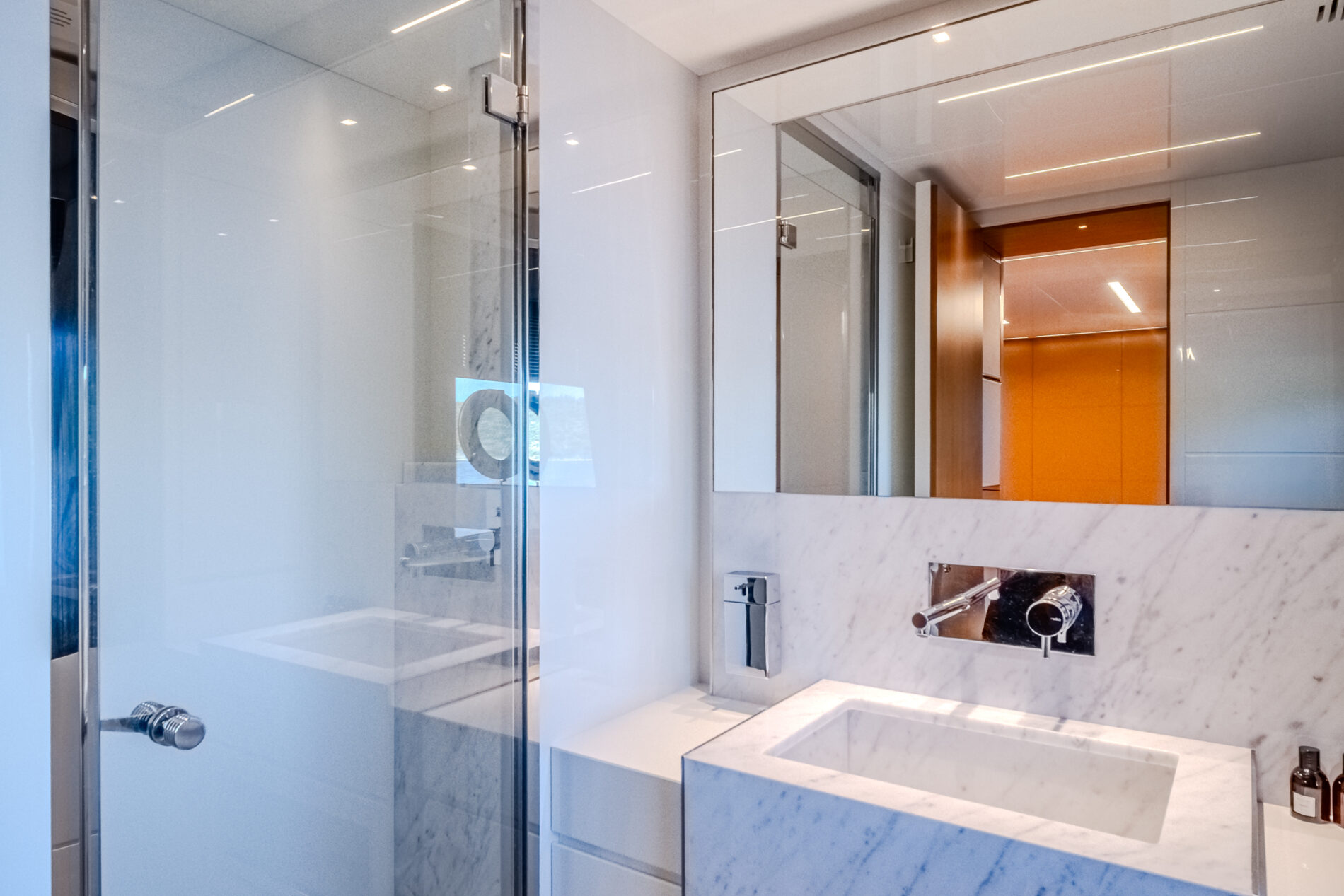 Her dynamic nature is highlighted by an ultra-sleek and slipstream exterior. The wide-body master stateroom, worthy of a mega-yacht, offers a large private area on the main deck. Below deck, there are four guest suites – 2 double and one twin.
