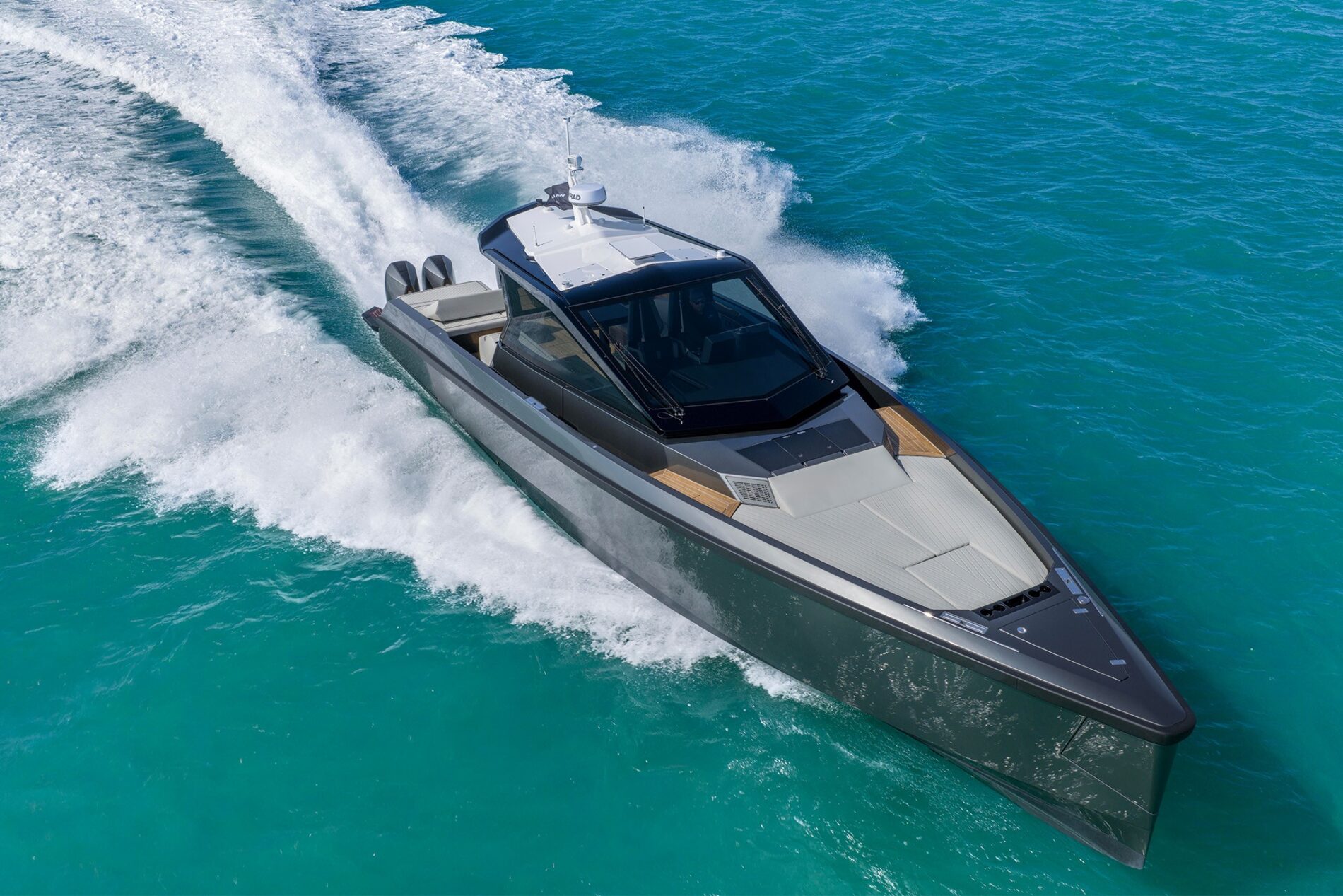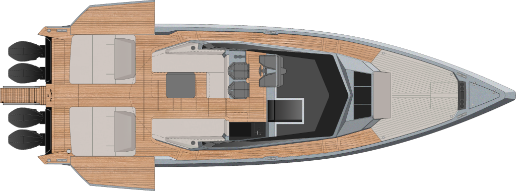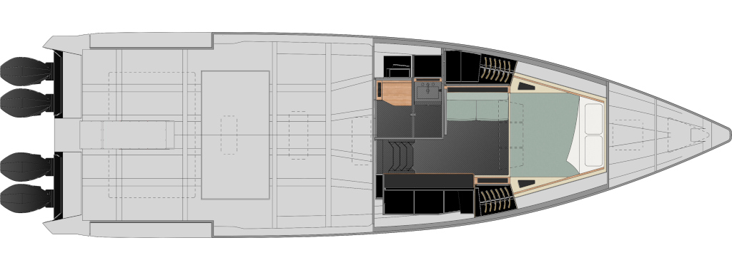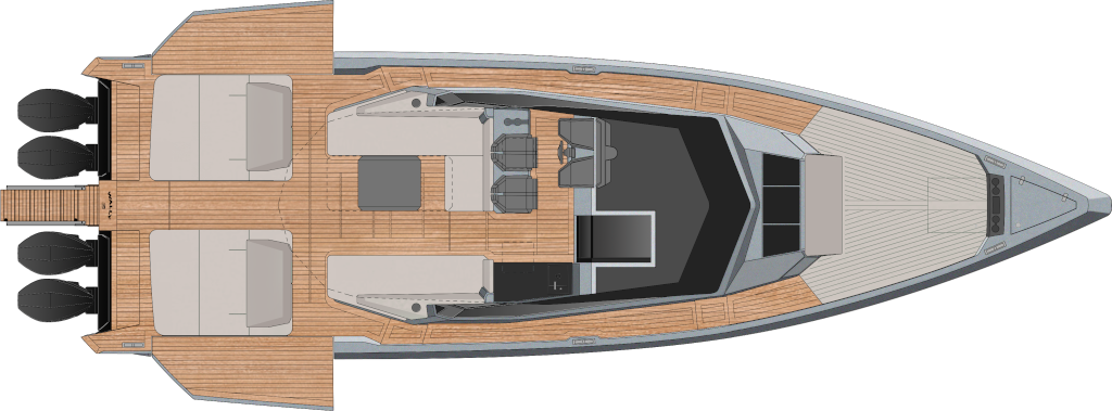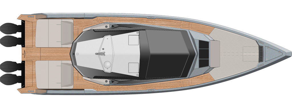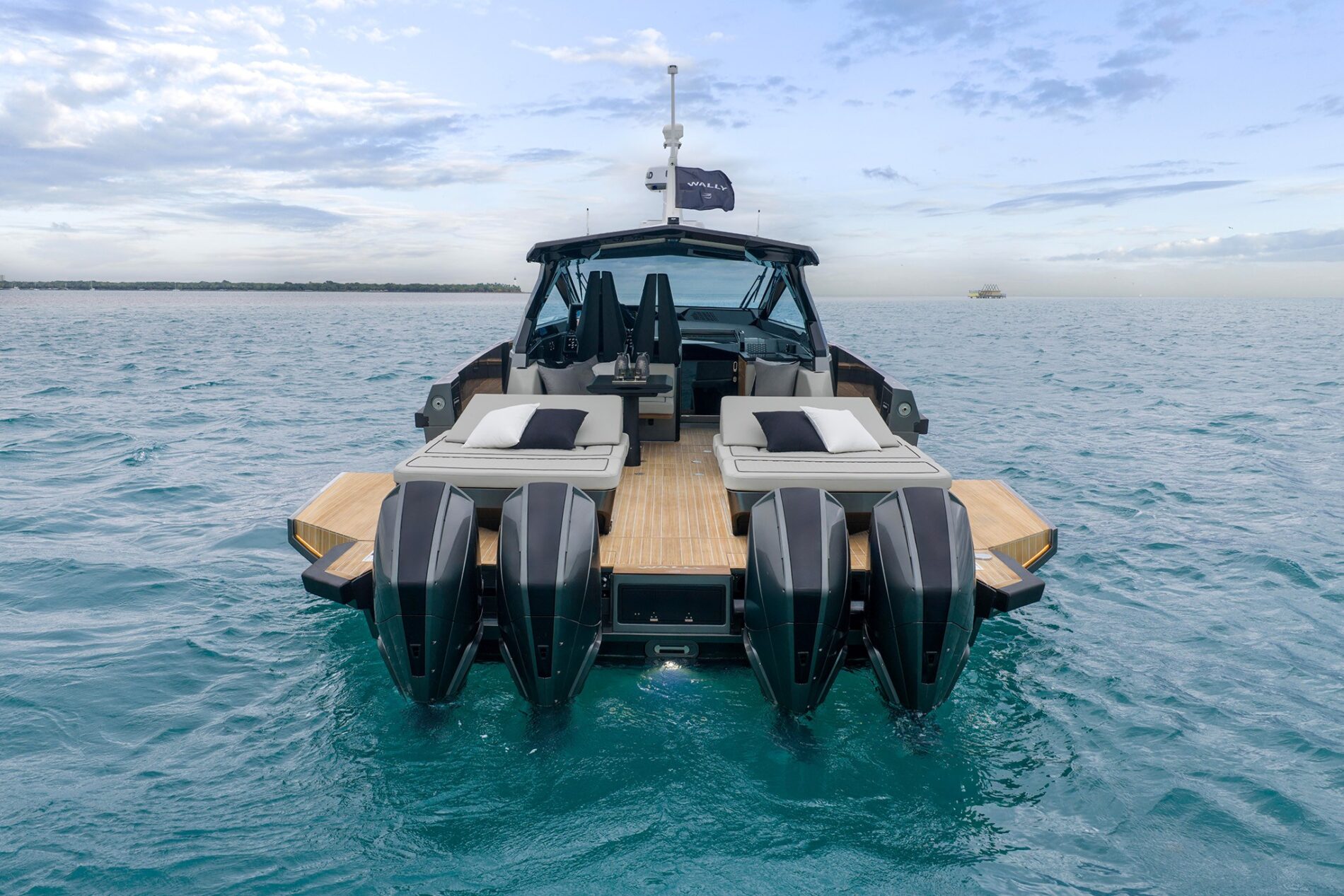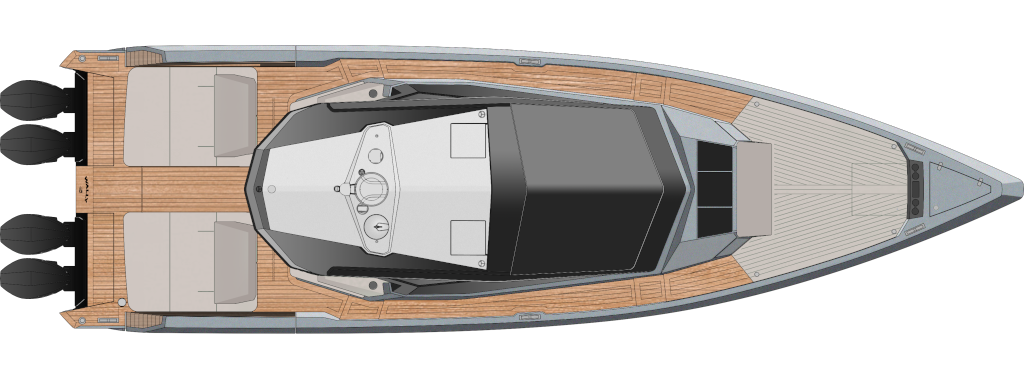 All Wally’s ‘X’ models are optimised for outboard propulsion, with a notch on the transom that can take four Mercury Racing outboards rated up to 500hp each. With this ultimate power package, expect thrilling speeds over 50 knots and an empowering range of 180 miles. Dial it back a fraction to 4 x 400hp engines, and you can still look forward to 48 knots and a range of 240 miles.