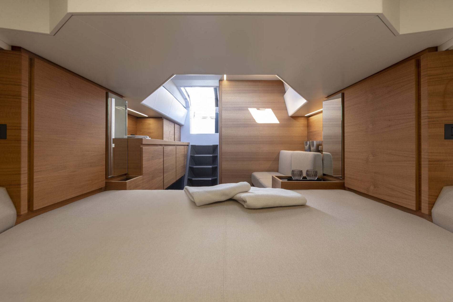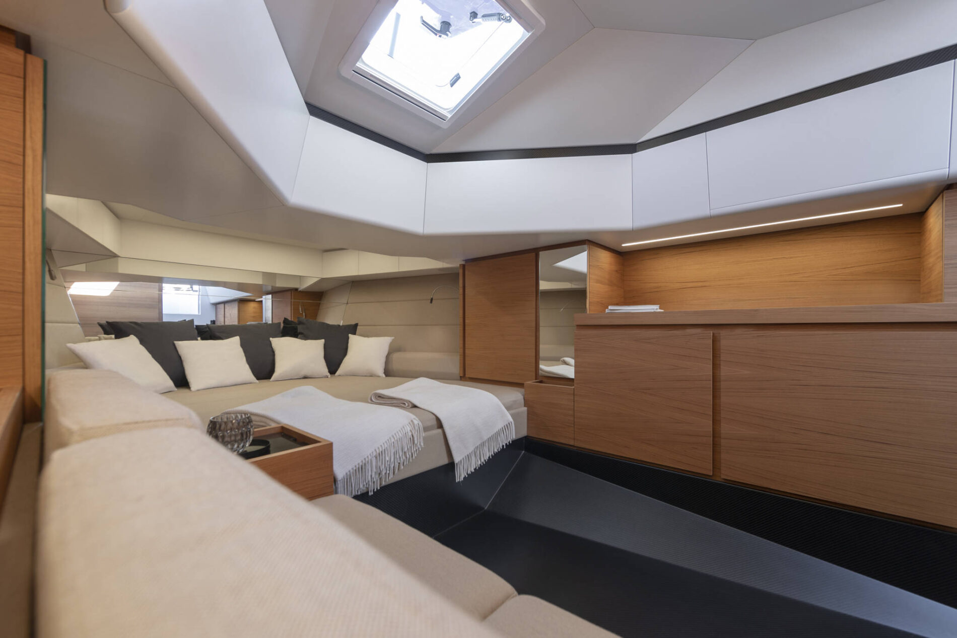 Carbon-fibre steps lead below deck to a stylish cabin for two, which includes a comfortable double V-berth, sofa seating, a vanity unit and plenty of clothes storage. An elegant shower room and heads round off the features that make the wallytender48X ideal for comfortable overnighting.