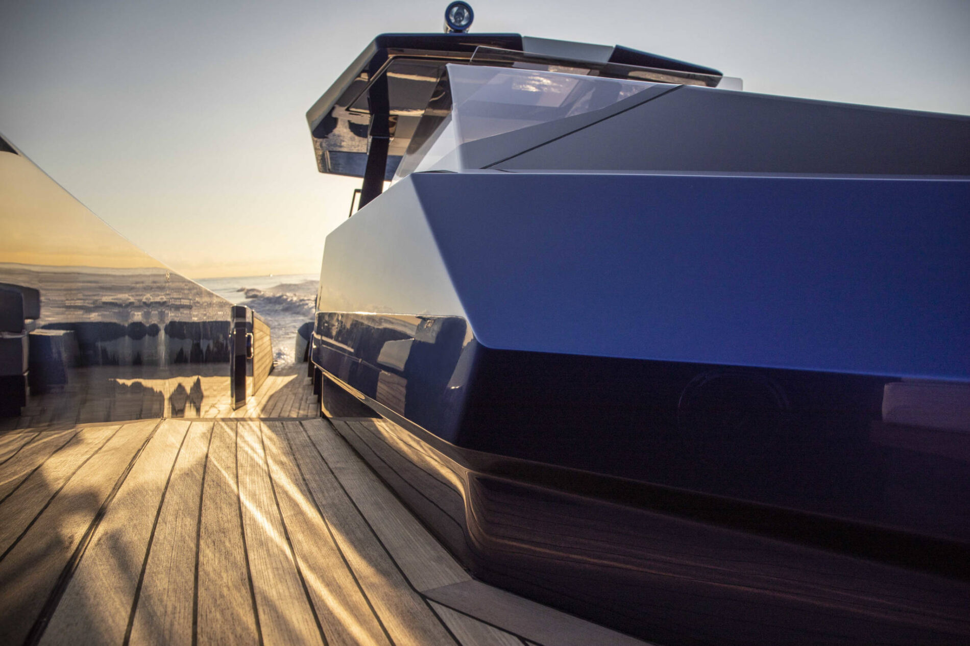 Of course, the yacht offers the same entertaining possibilities as its inboard sister. In typical Wally style, the aft wings open to dramatically extend the deck, while the cockpit offers flexible seating, dining and lounging. The walkaround flush deck gives easy access to a forward sun lounge. Wally has also found a unique way to retain the combined passerelle / bathing ladder in spite of the outboards on the transom.