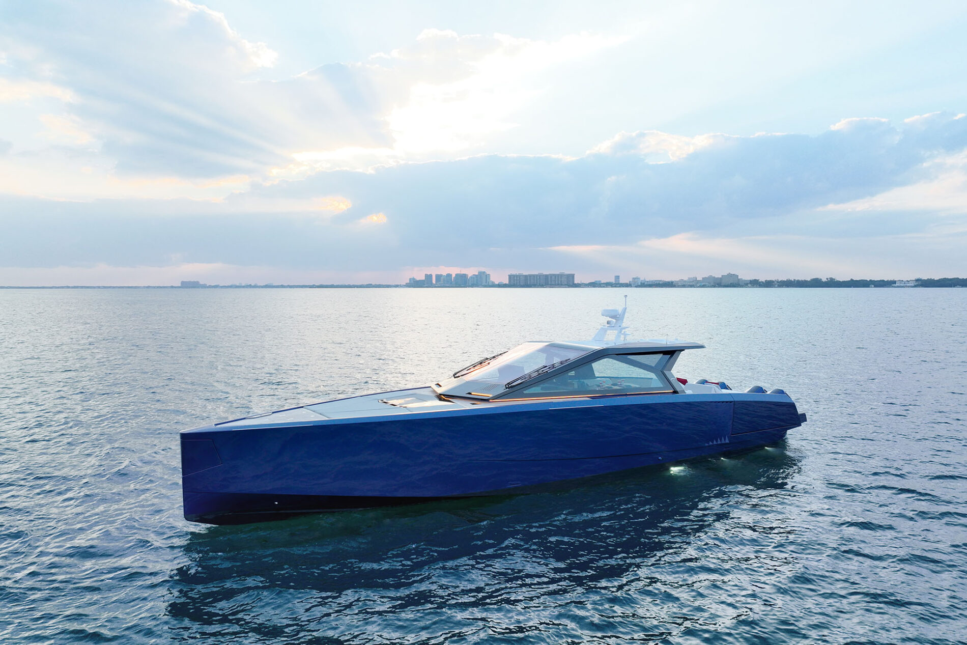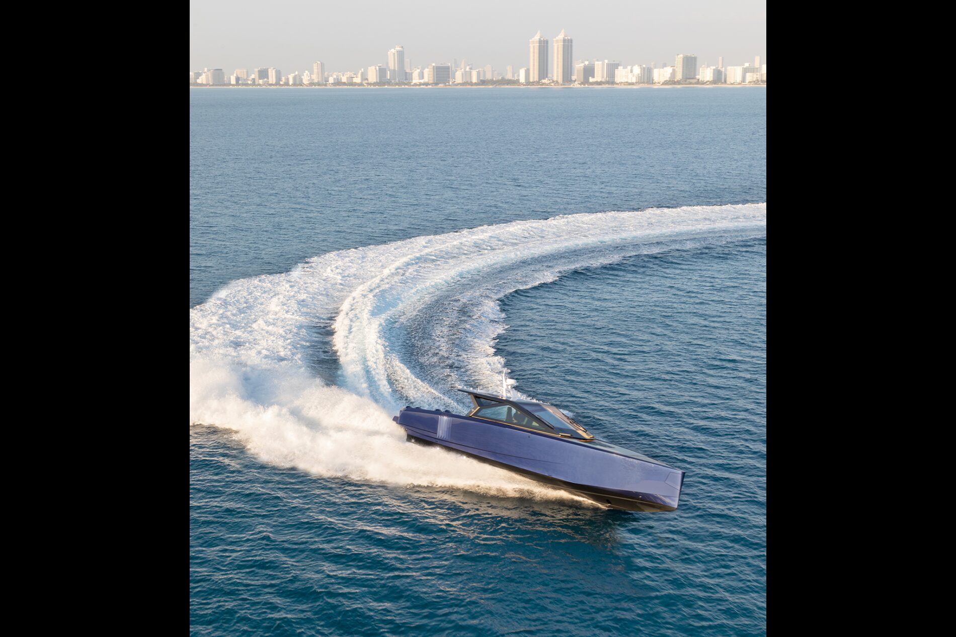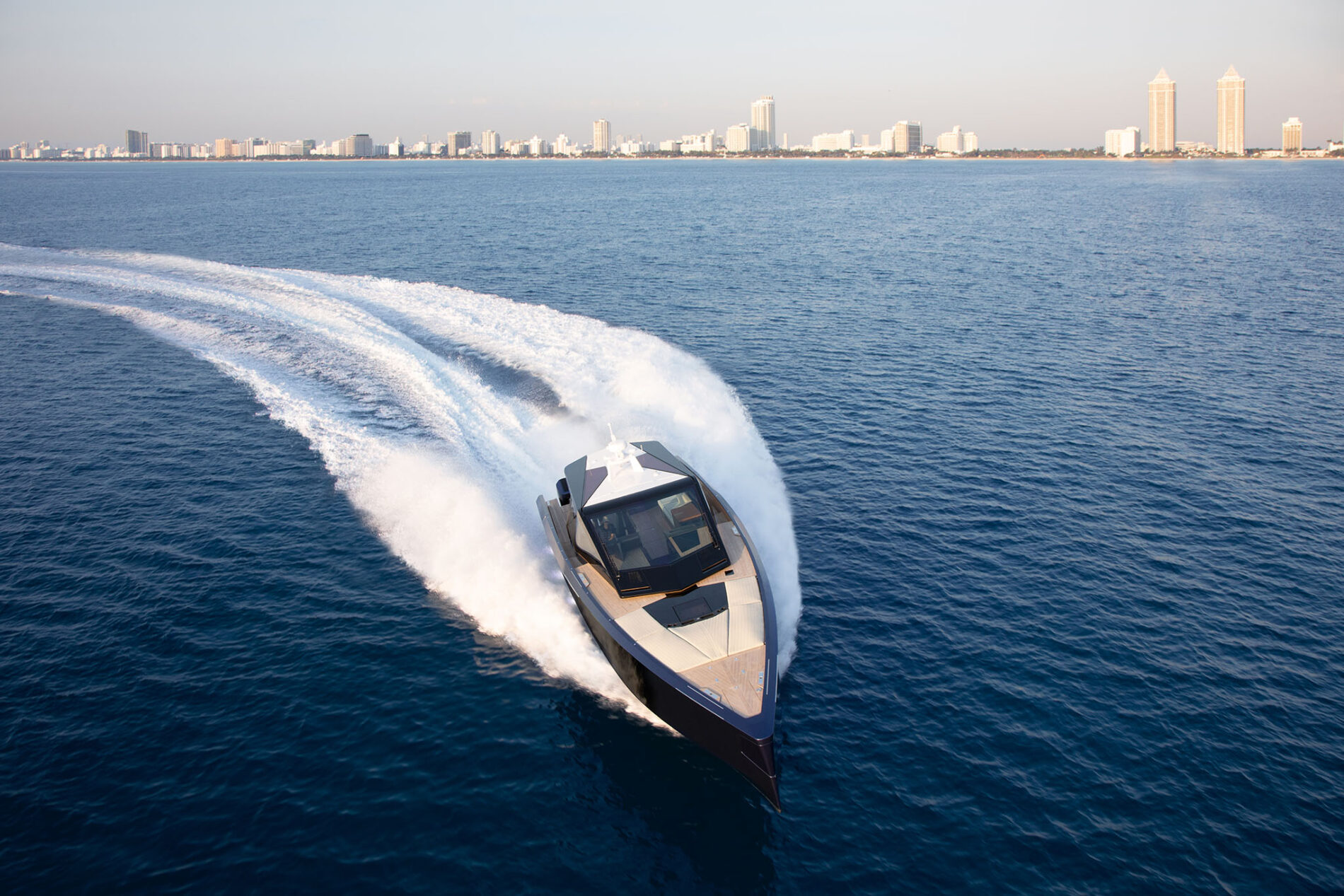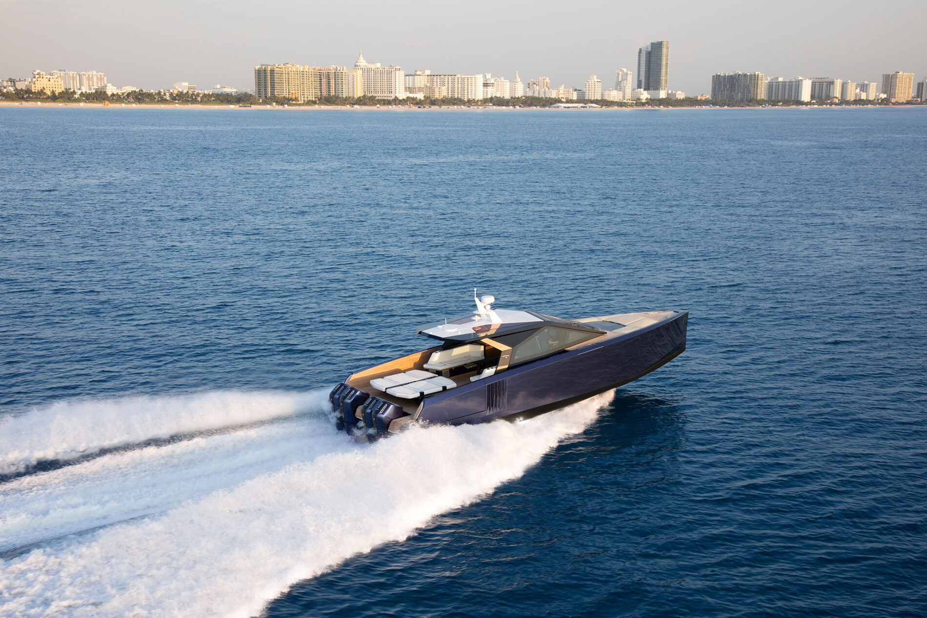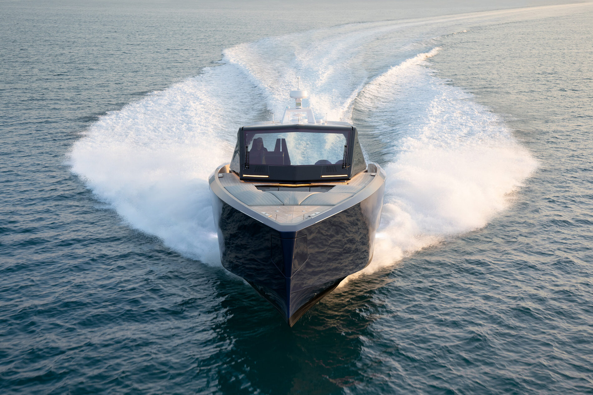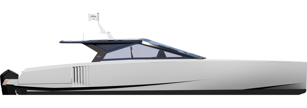 It is the first Wally yacht to be fitted with the new 600hp Mercury V12 Verado – or rather, a powerful configuration of four of them. With 2,400hp on the transom, the stable and efficient deep V-hull can reach an exhilarating 50 knots. And yet fuel consumption remains low, while the boat’s additional tankage gives it a range of 300 nautical miles.