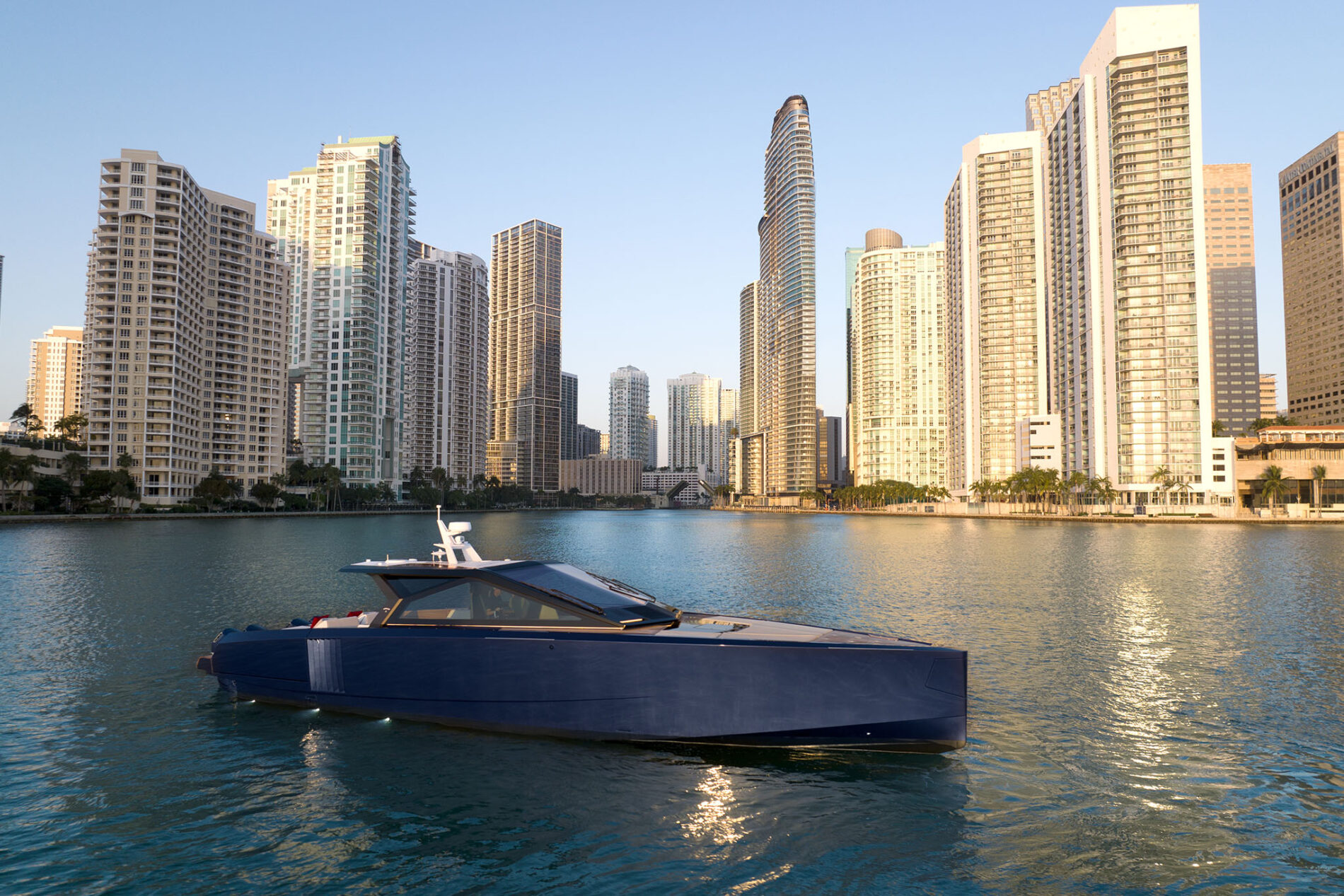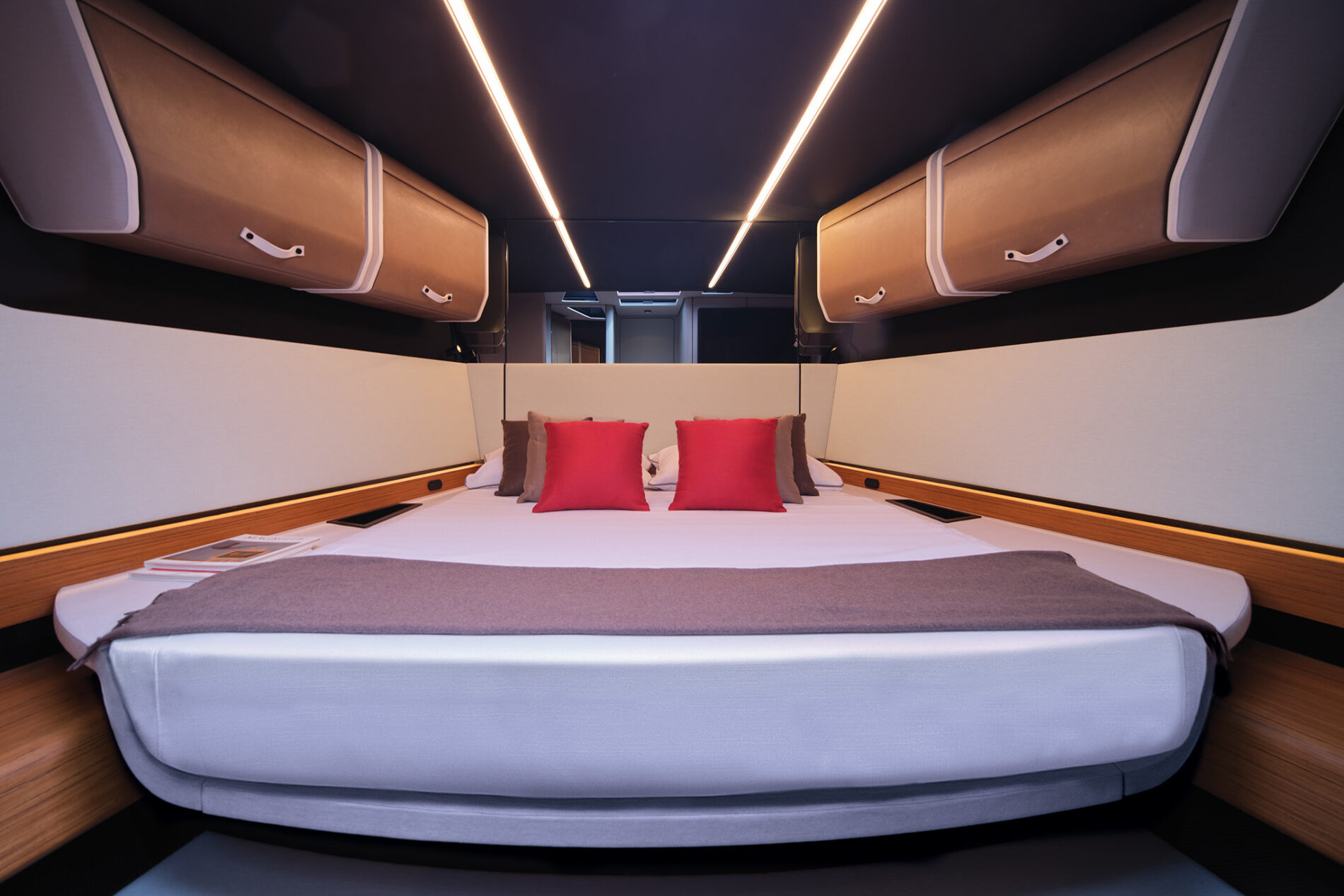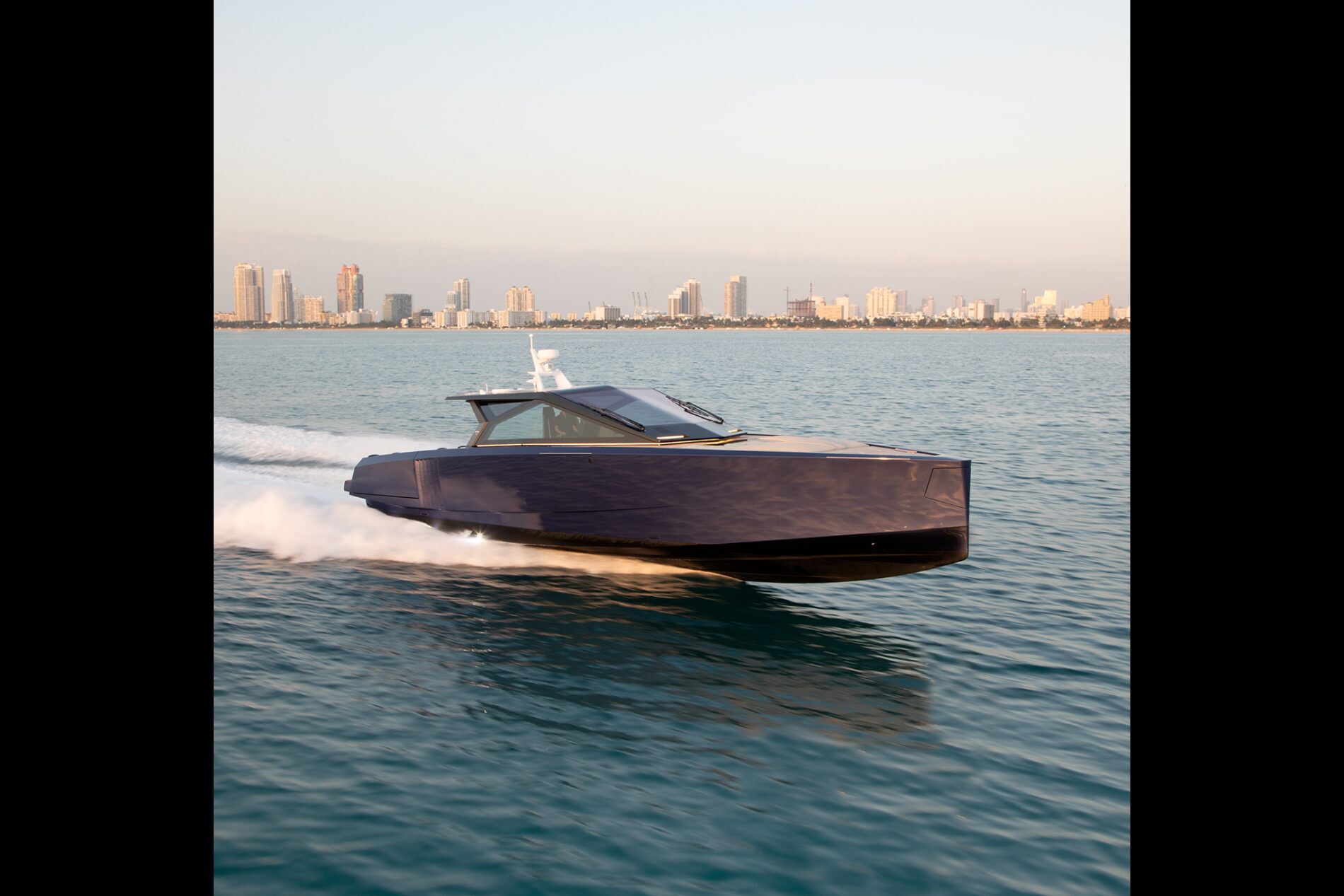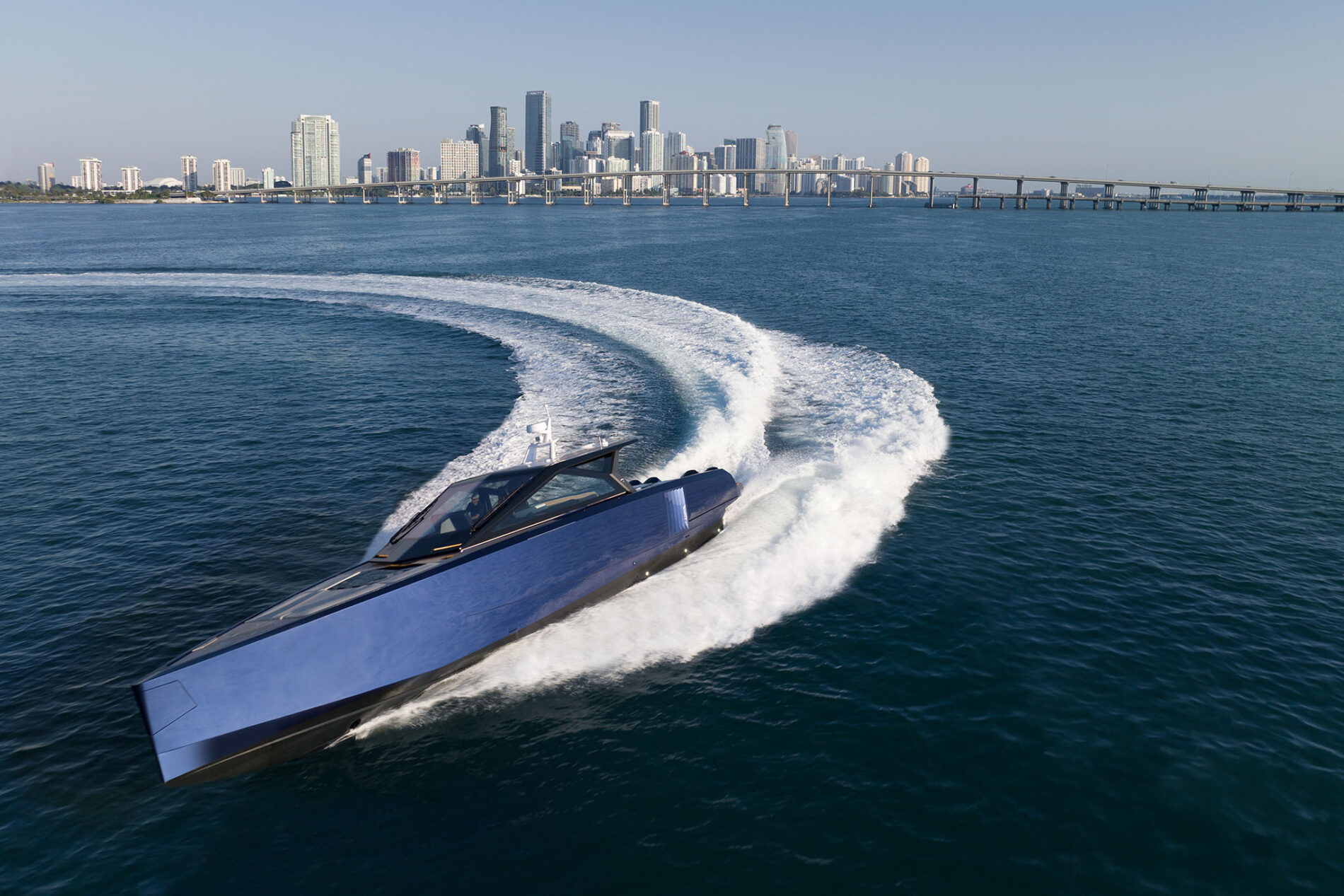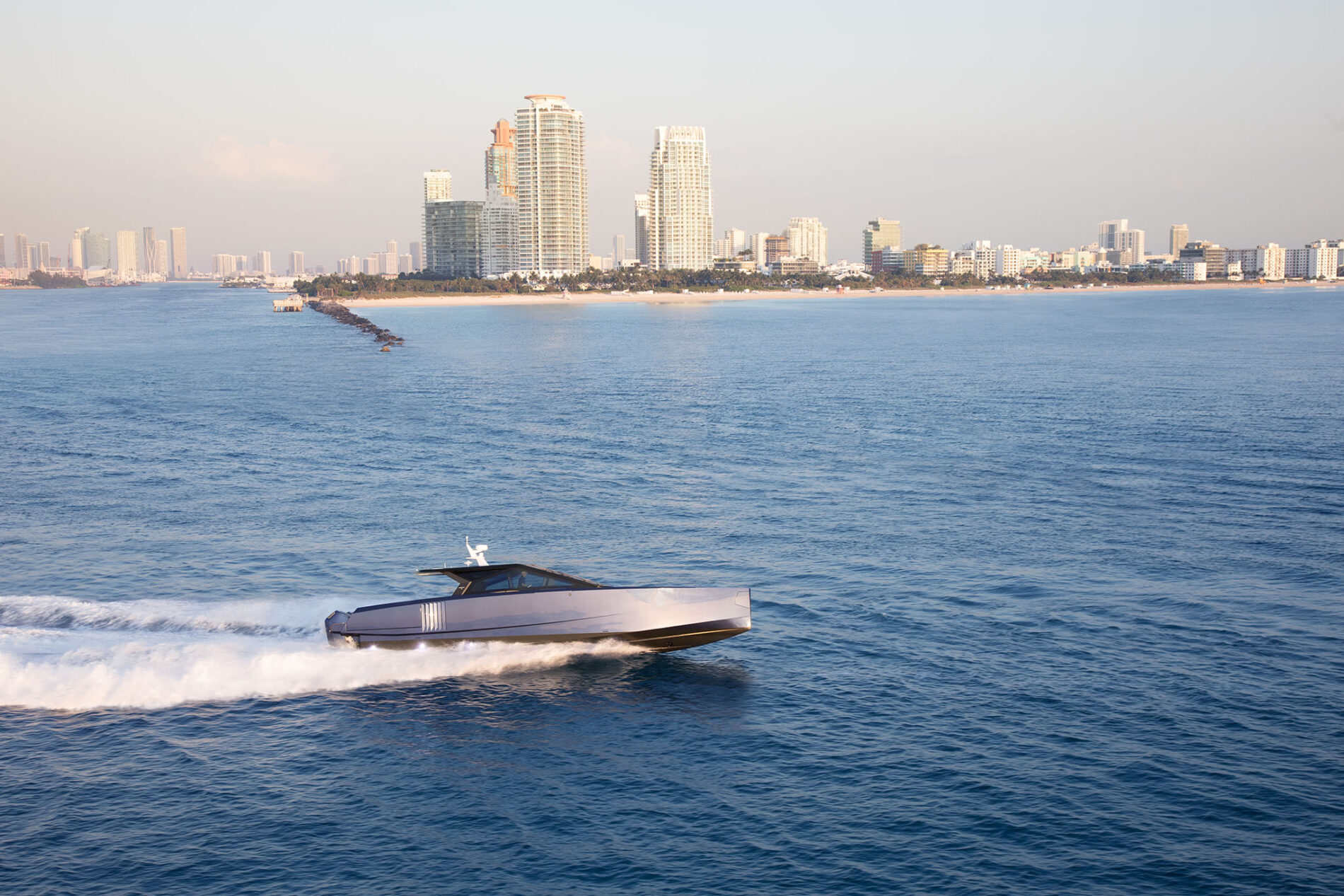 It is the first Wally yacht to be fitted with the new 600hp Mercury V12 Verado – or rather, a powerful configuration of four of them. With 2,400hp on the transom, the stable and efficient deep V-hull can reach an exhilarating 50 knots. And yet fuel consumption remains low, while the boat’s additional tankage gives it a range of 300 nautical miles.