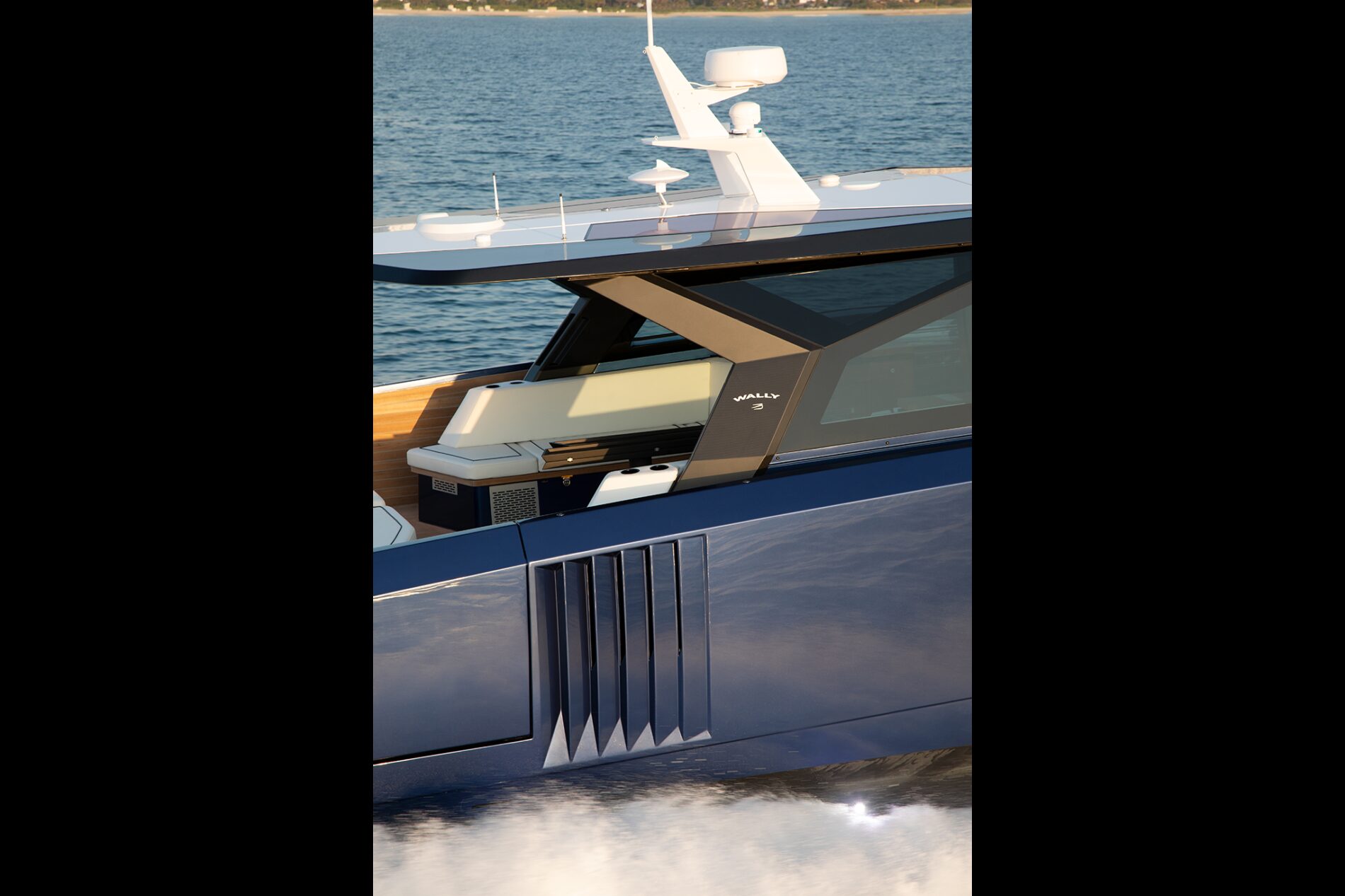 Performance is therefore a given, but Wally has also exploited other capabilities offered by the new Mercurys. They have a reduced draft compared to other models, making the boat suitable for shallow water operations, while the rotating gearcases and joystick manoeuvring system ensure trouble-free precision docking in tight spaces.