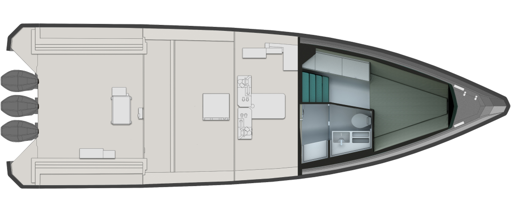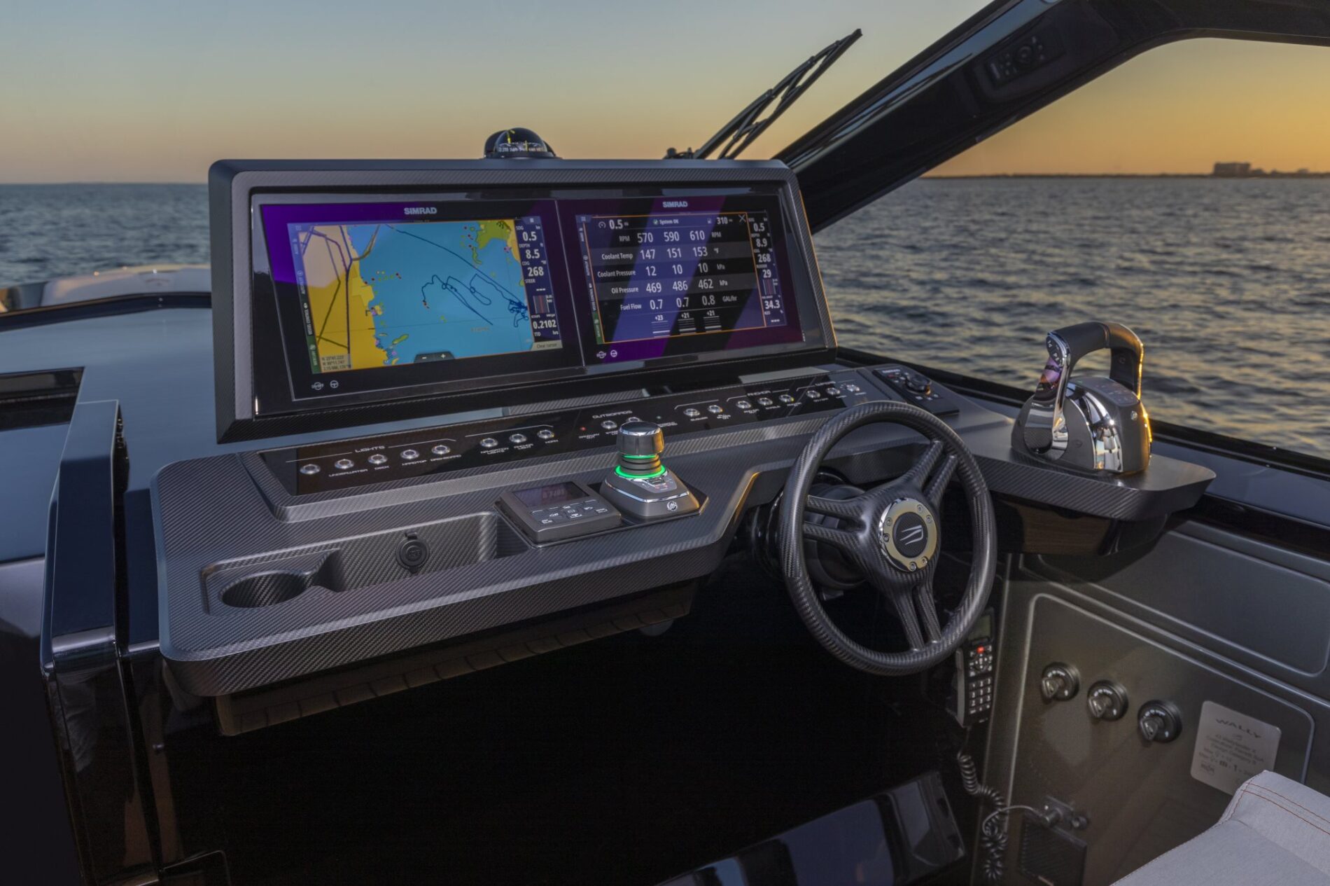 Fold-down aft wings enlarge the entertaining space, which can be configured with a characteristically smart array of articulated sunpads and sofa. And uniquely for an outboard model, we have found a way to retain the hydraulic passerelle that doubles as a swim ladder at the stern.