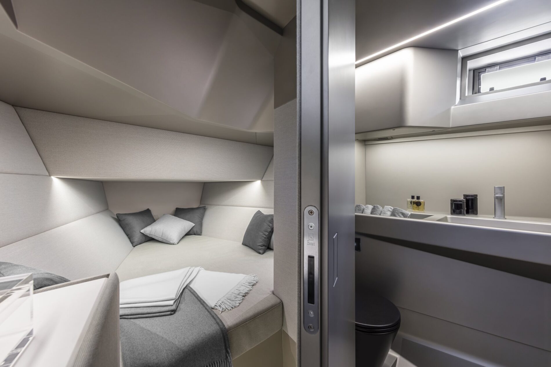 Though conceived for outdoor living, the wallytender43X has an extremely comfortable double berth below. The space is naturally air conditioned and complemented by a generous bathroom with separate walk-in shower.