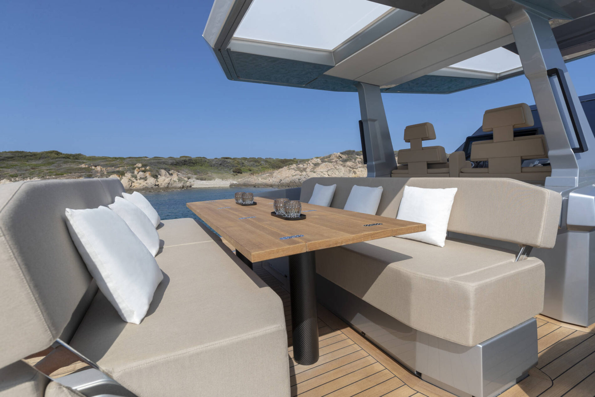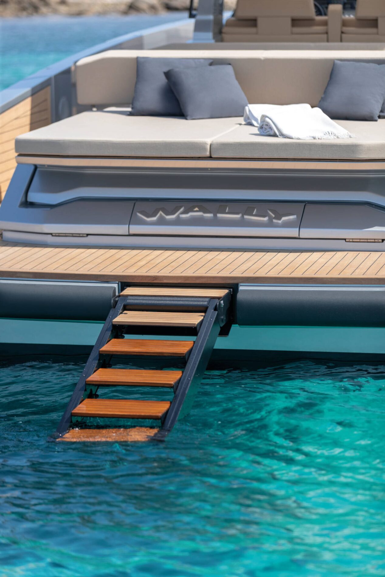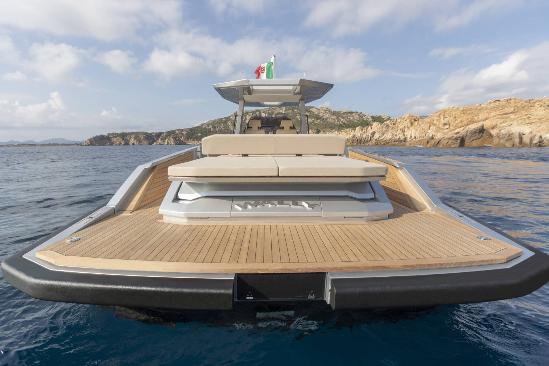 A lavish expanse of flush decking invites guests to indulge themselves on one of the comfy sunpads or seats that run from the forward lounge back to the deep cockpit. Versatile backrests allow you to switch the focus from the dining table and galley unit to the sunpad, while Wally's much-imitated aft wings fold down to maximise the entertaining space.