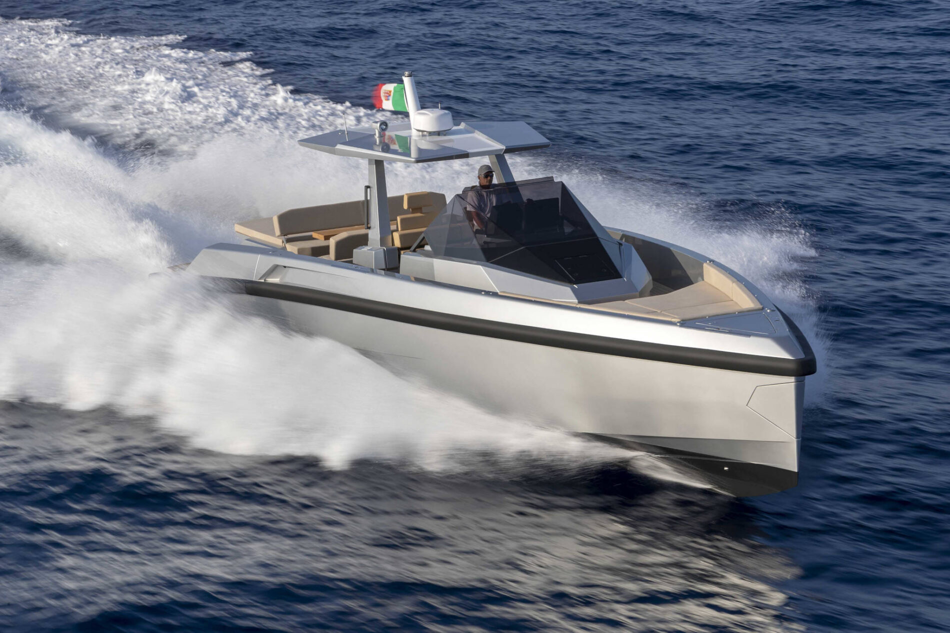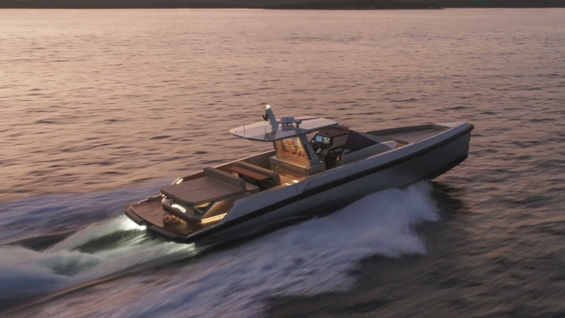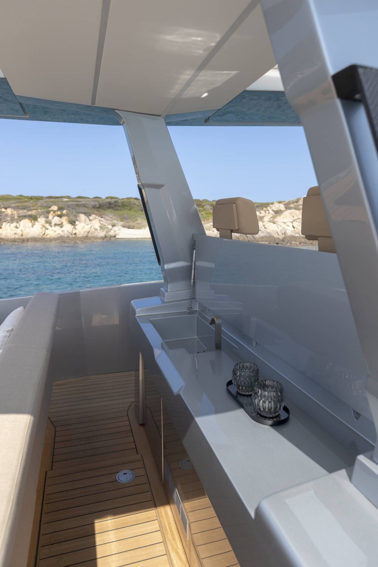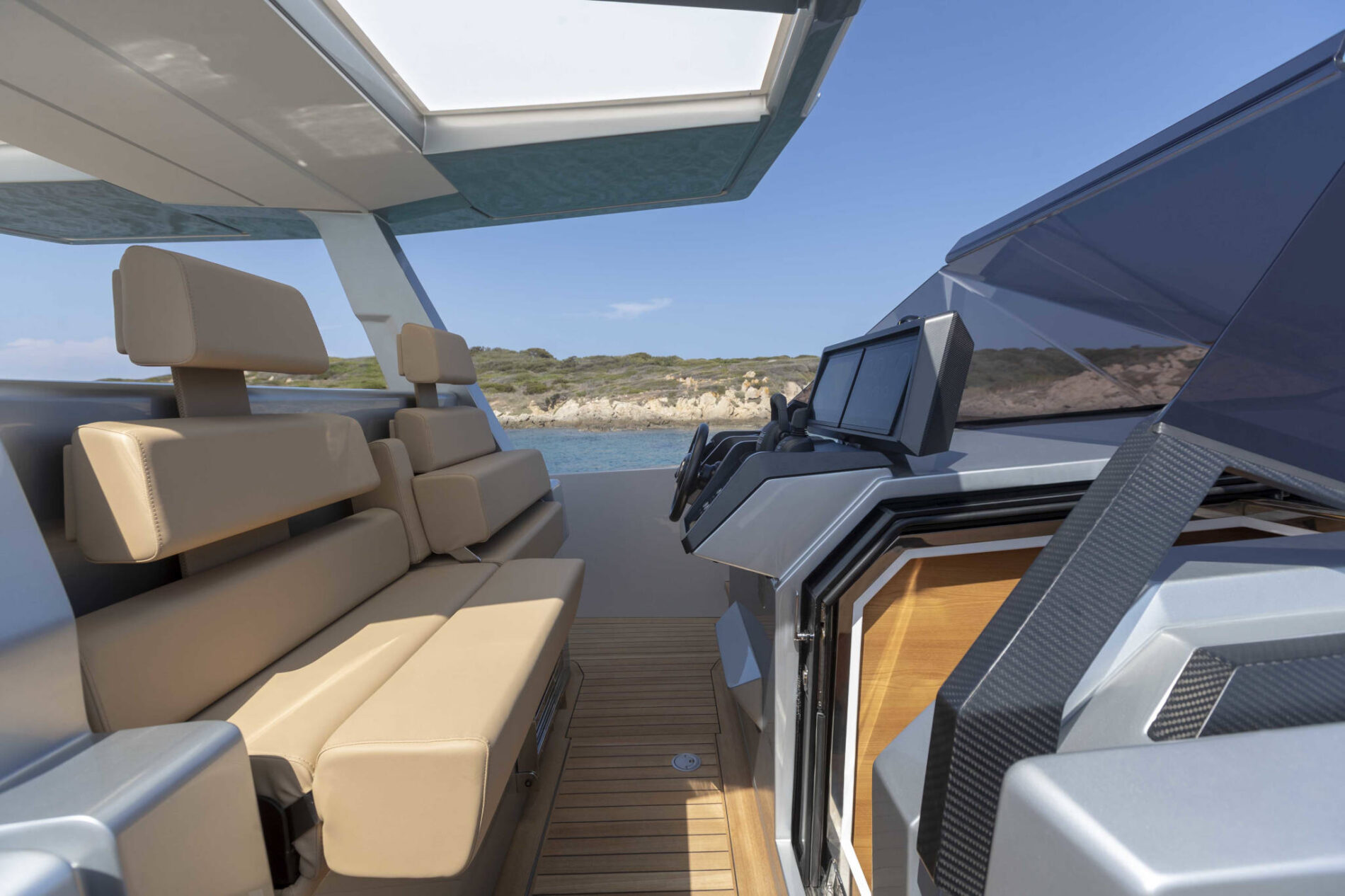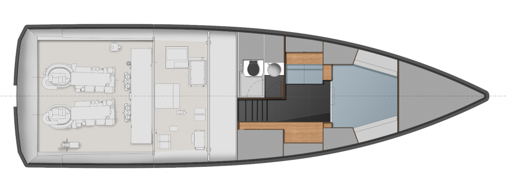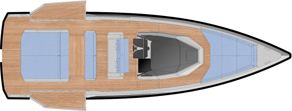 Driving pleasure is second to none. Joystick controls and a wraparound fender system make light of manoeuvring. Meanwhile, twin Volvo Penta IPS 650 drives deliver top speeds of 38 knots and a cruising range of 300nm. All in perfect comfort with minimal slamming, thanks to the vertical bow and automated interceptors.