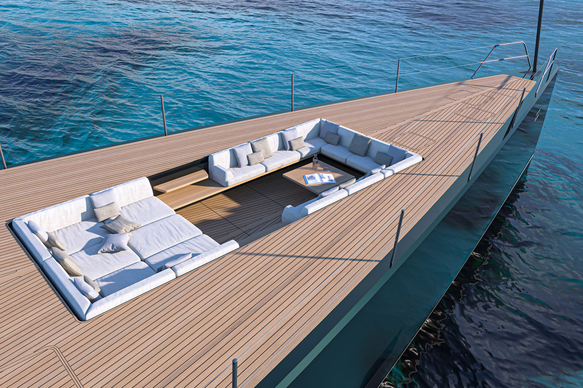 Guests will be enchanted by the many relaxing possibilities, and the size of the beach club aft. But perhaps most of all by the forward cockpit, whose elegant teak steps and deep seating are revealed once the 5.0m tender has been launched.
