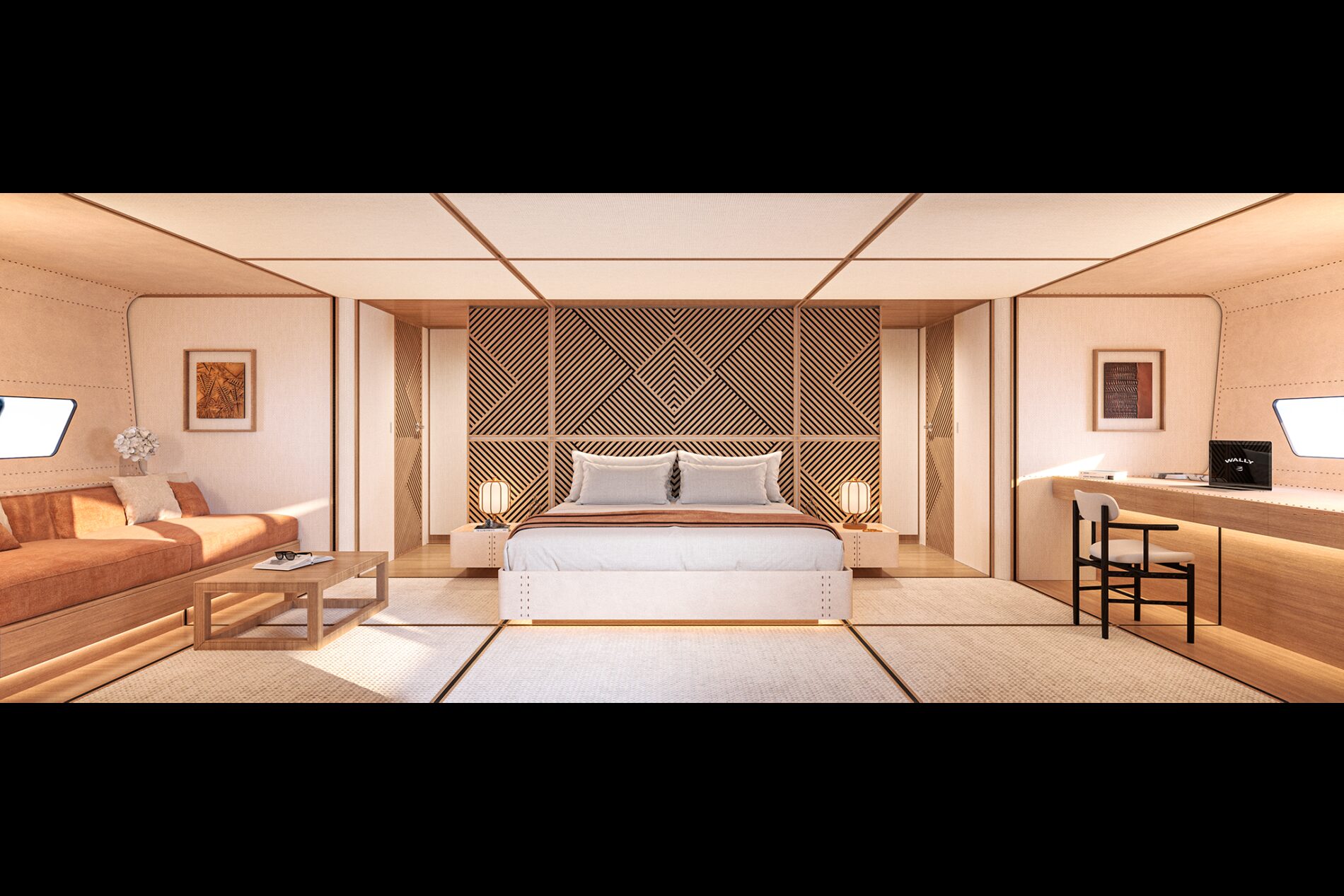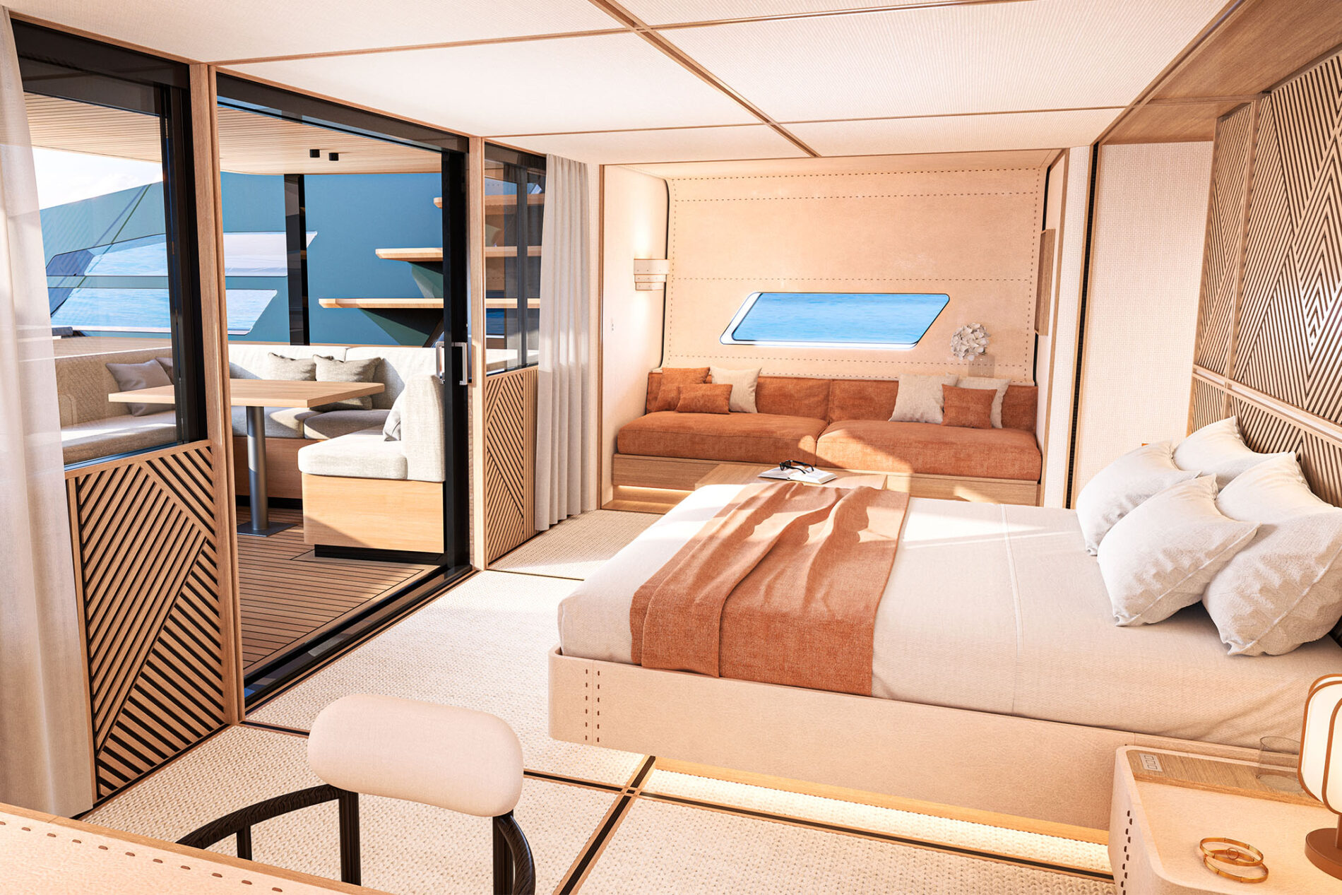 The ’double deck’ design reaches its zenith in this yacht, which puts the full-beam owner’s cabin right aft where it can benefit from a unique private lounge. This flexible indoor-outdoor space lies between the grand double doors to the owner’s suite and the ‘terrace-on-the-sea’ beach club. It is hard to imagine a better equipped owner’s cabin, with the sort of dimensions usually only seen on land.